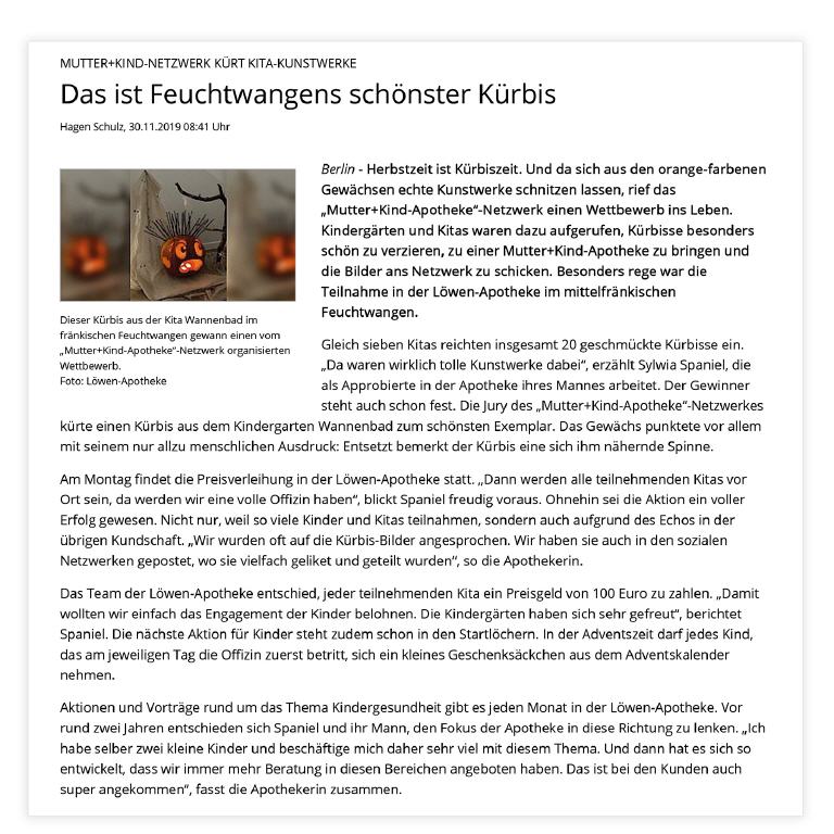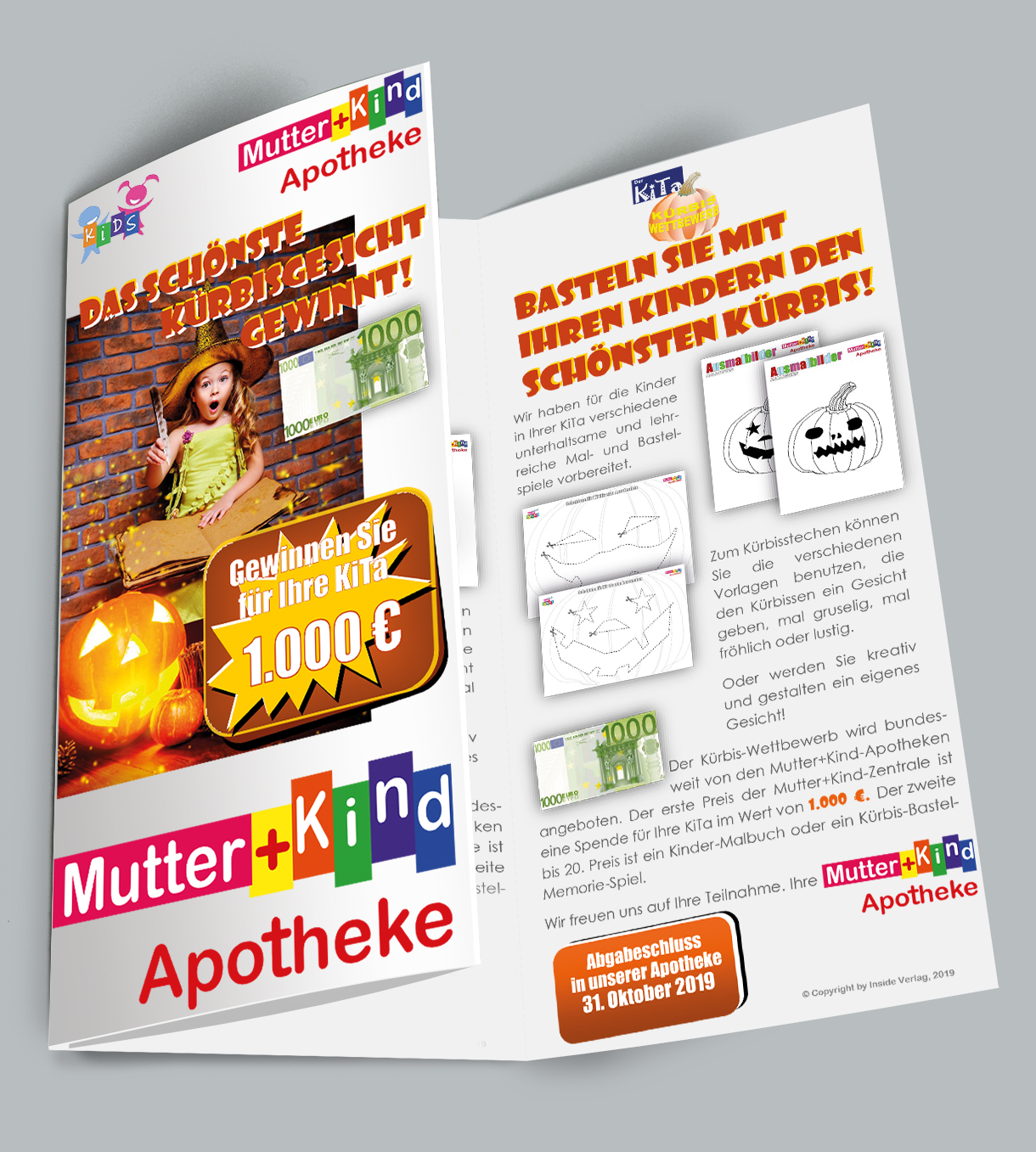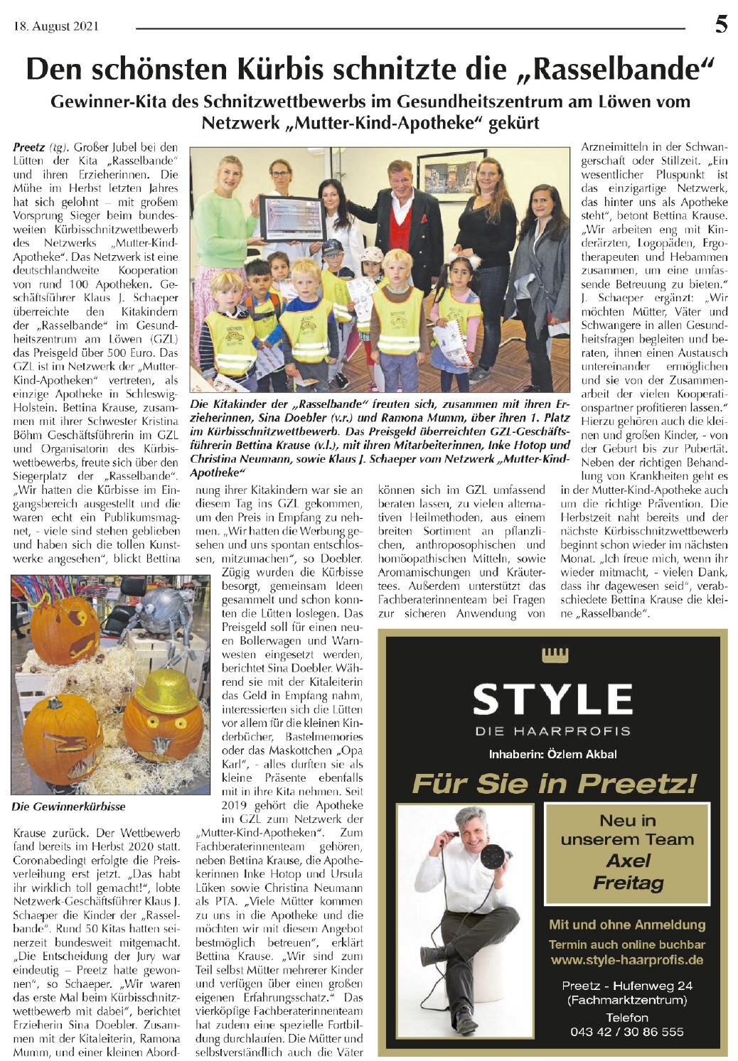 An dem beliebten Kürbisschnitzwettbewerb hatten bundesweit wieder viele Kitas mit kreativen Ideen und viel Einsatz teilgenommen. Coronabedingt konnte die Preisverleihung erst im August 2021 stattfinden. In der Apotheke Gesundheitszentrum am Löwen unter der Leitung von Bettina Krause, wurde das Preigeld von 500,- € an die Erzieherinnen der Kita "Rasselbande" Sina Doebler und Ramona Mumm übergeben.
