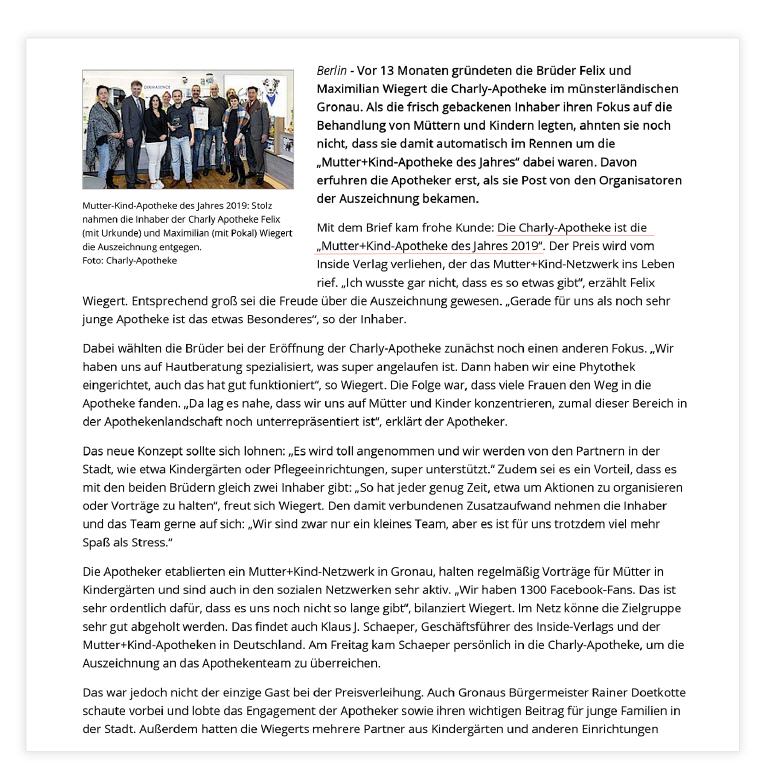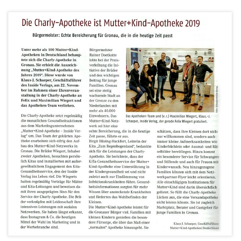 Wir danken der Charly Apotheke in Gronau für den vorbildlichen Aufbau des Mutter+Kind Netzwerkes und ihren tollen Einsatz für junge Mütter und Familien in ihrem Ort.